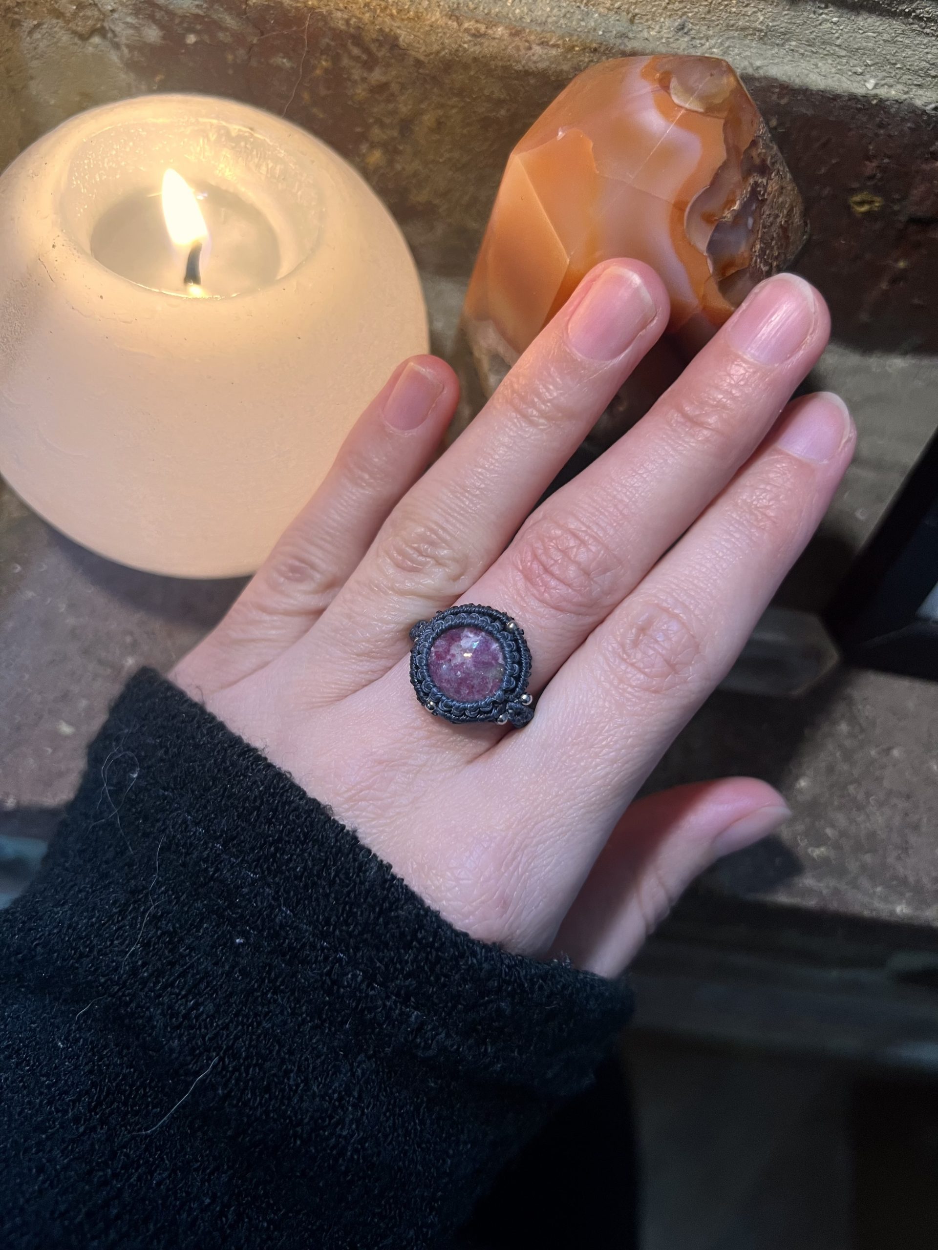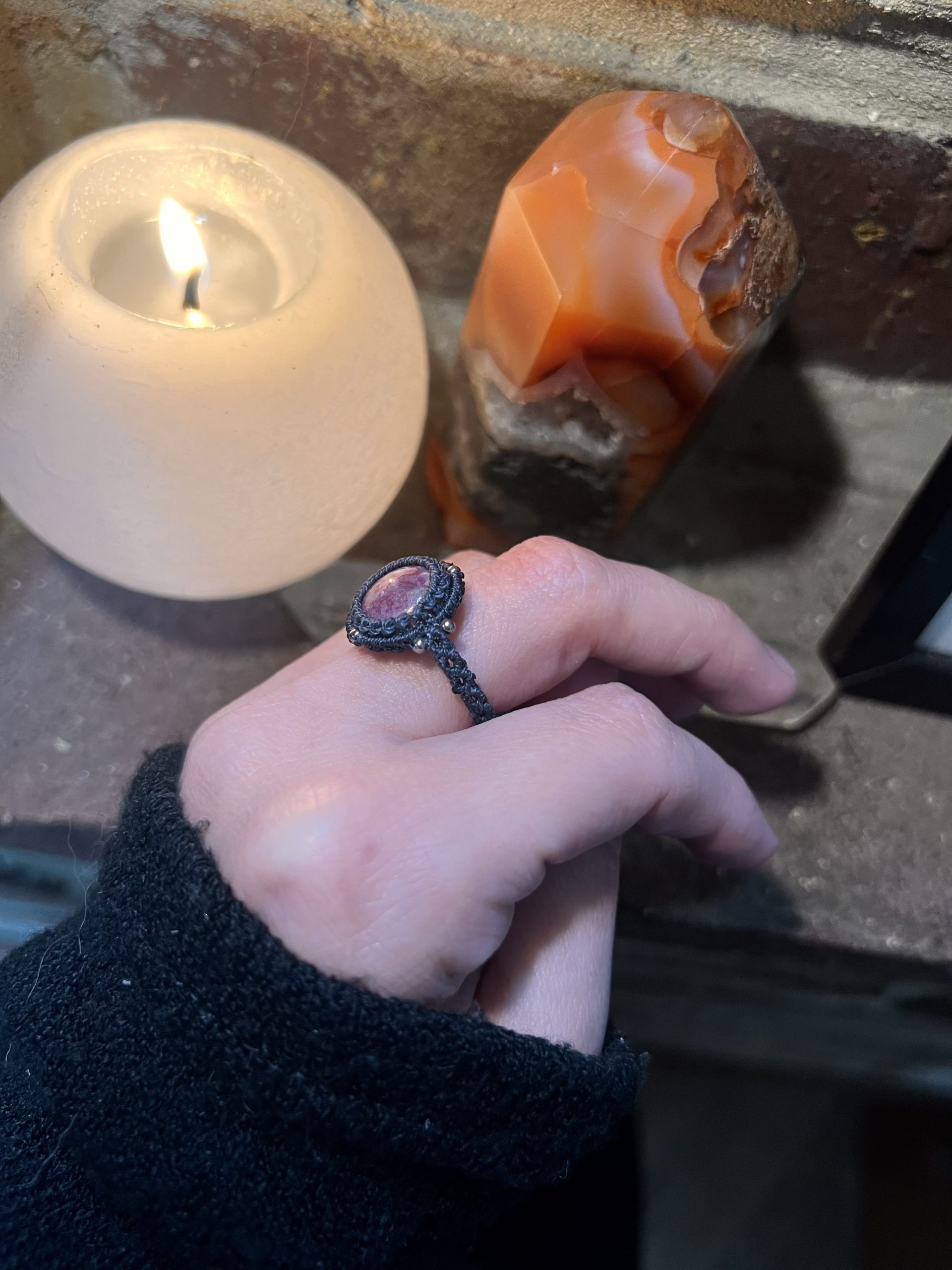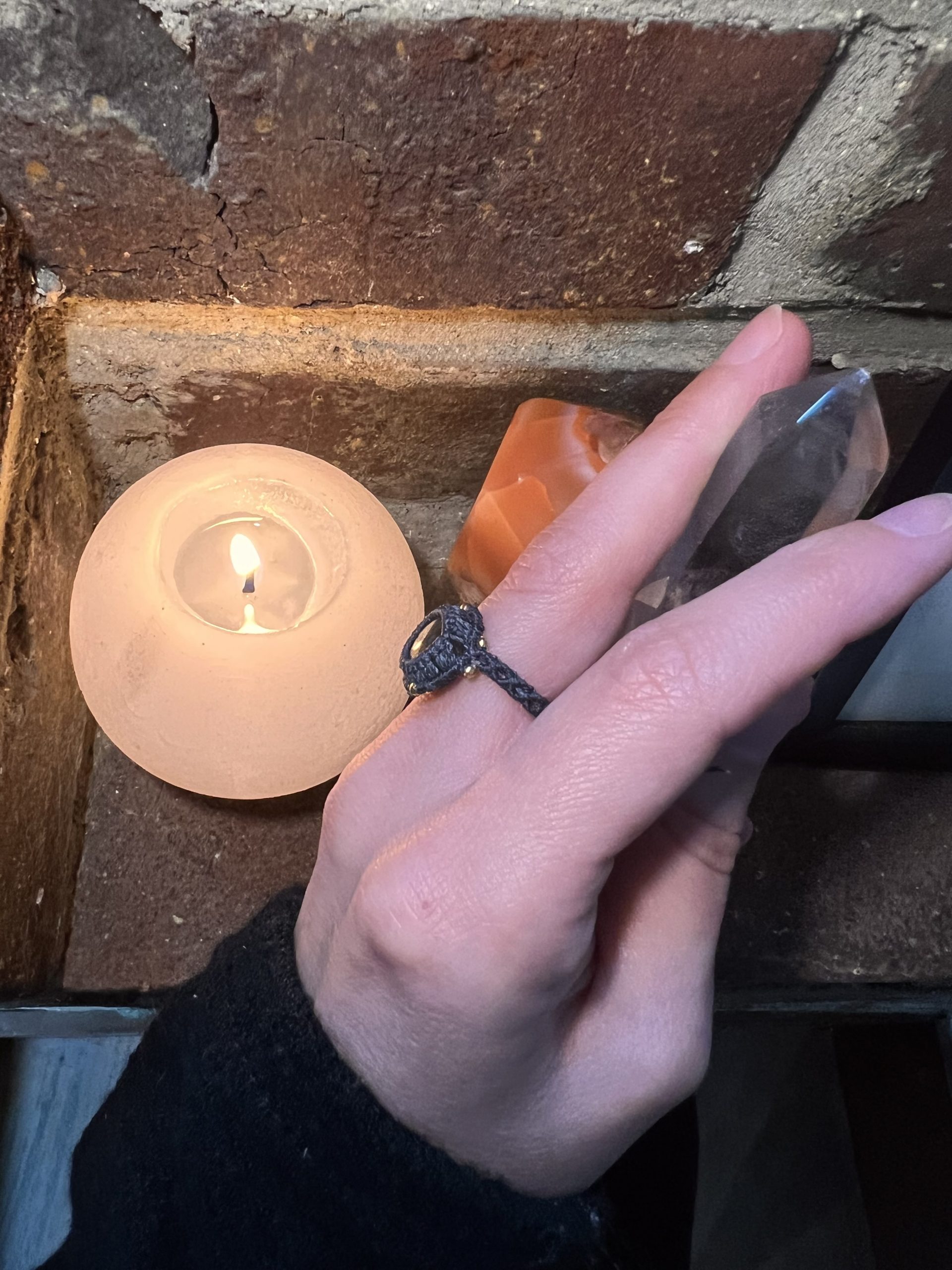 Cette bague pierre naturelle sur mesure “Larme de fée” est une création artisanale, entièrement tissée à la main en micro-macramé fin.
