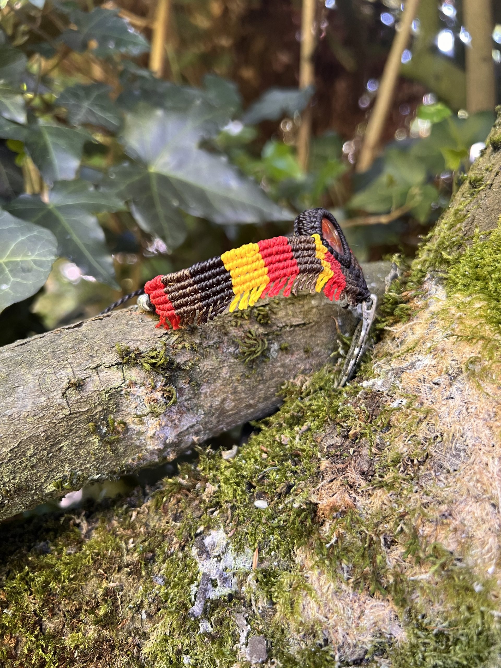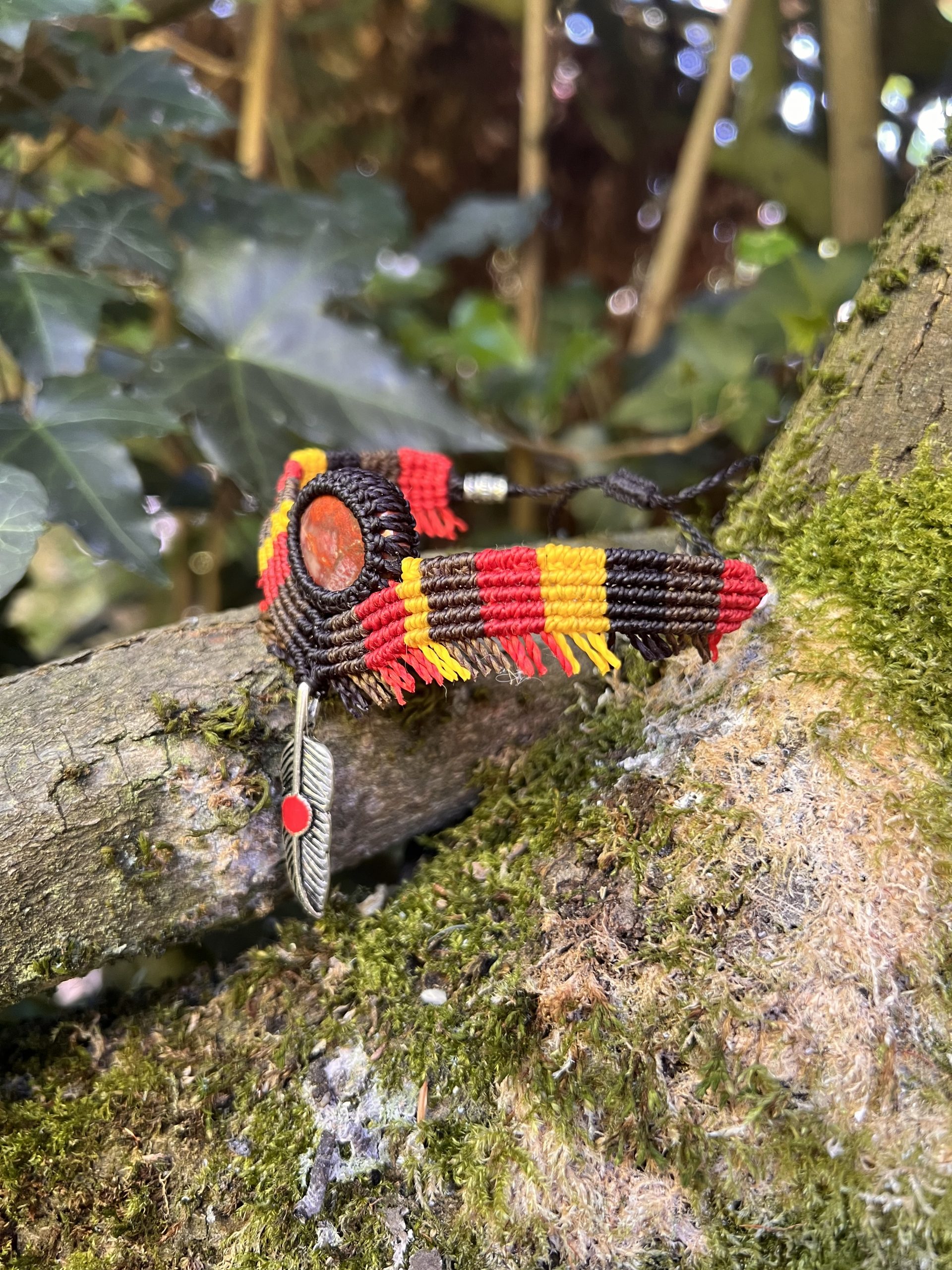 Le bracelet de cheville “Antonio” est une pièce unique inspirée de l’univers amérindien, tissée à la main en micro-macramé avec une pierre en bois fossile.