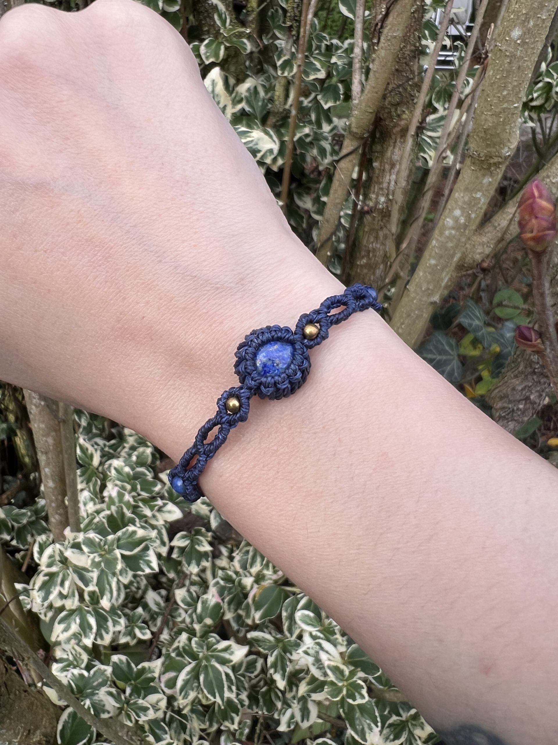Bracelet fin en Lapis-Lazuli naturel, tissé à la main en micro macramé. Bijou artisanal délicat, léger et élégant, idéal pour un port quotidien.