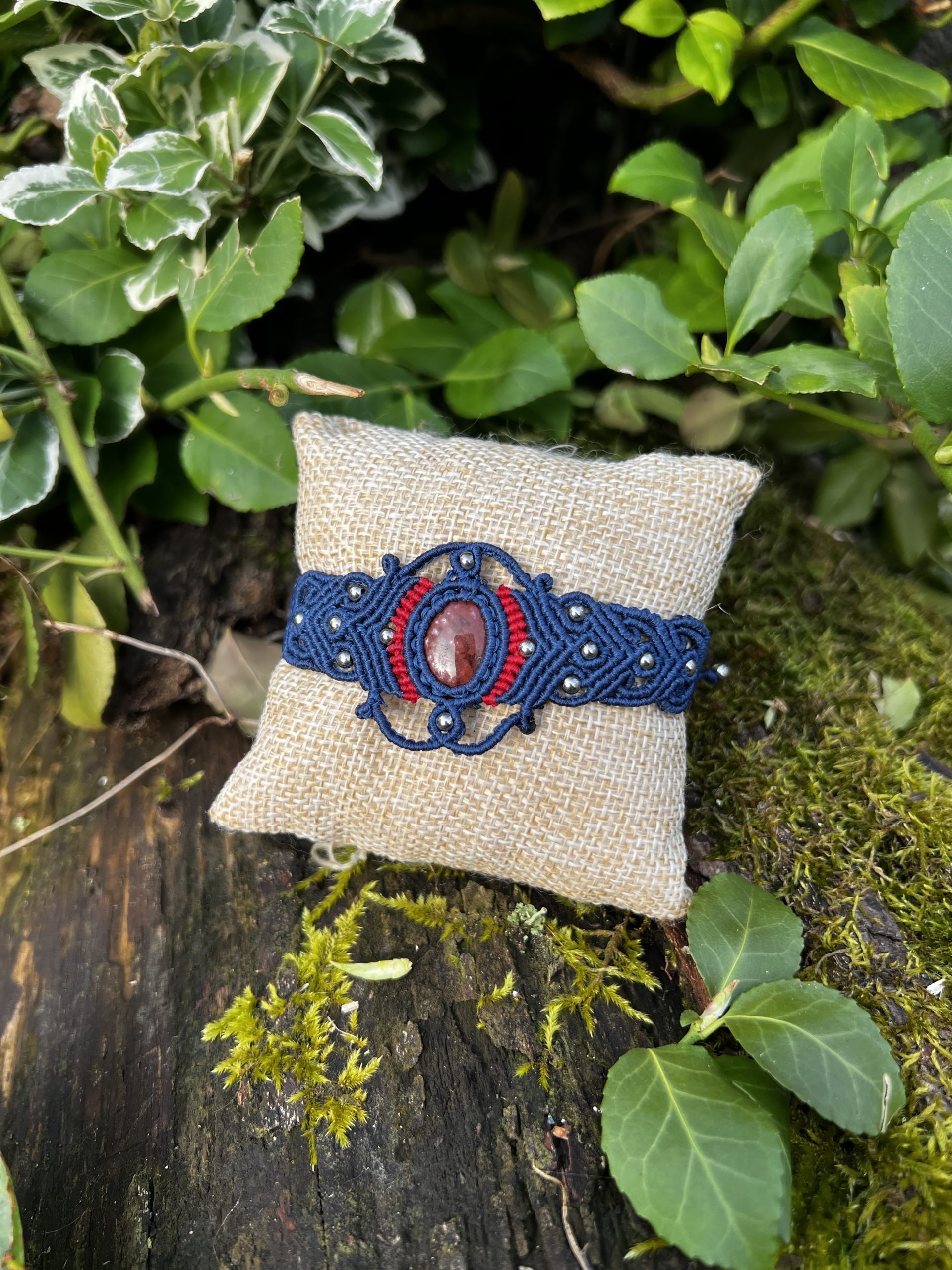 Ce bracelet a été entièrement réalisé à la main en micro-macramé avec du fil plat, mettant en valeur un magnifique jaspe rouge orbiculaire.
