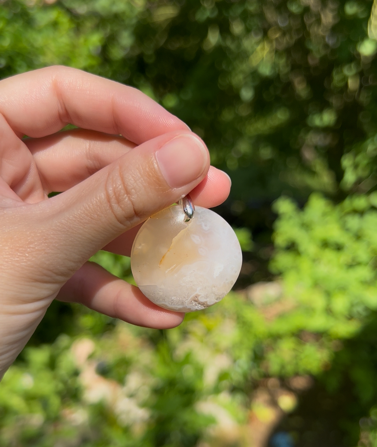 Pendentif en Agate Fleur naturelle avec une petite géode formée naturellement en son cœur, offrant un charme unique.