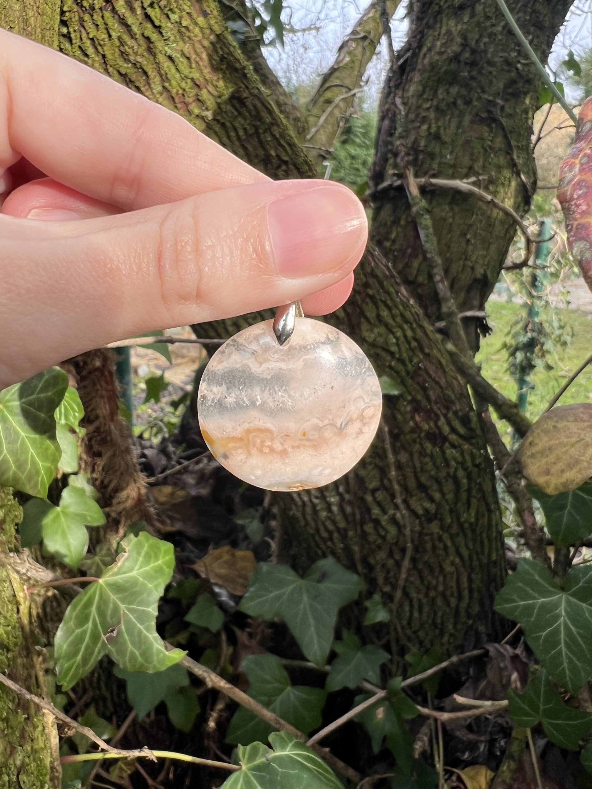 Pendentif en Agate Fleur naturelle, pierre rassurante et apaisante, liée au chakra cœur et au chakra coronal. Elle aide à calmer le mental, clarifier les pensées et revenir à l’instant présent. Favorise un ancrage doux et l’équilibre entre terre et ciel.