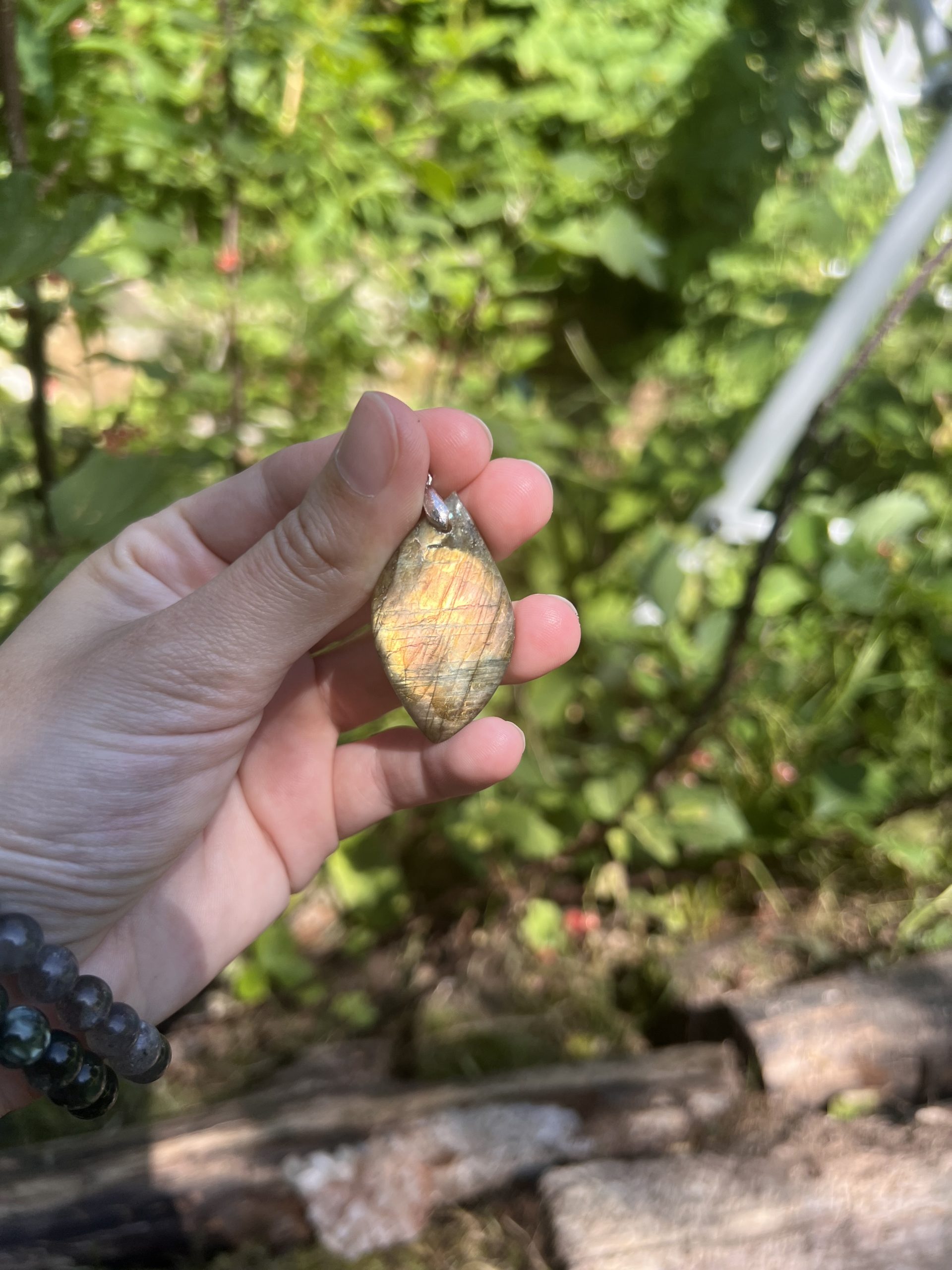 La Labradorite orange est une pierre naturelle de haute vibration, recherchée pour sa protection énergétique puissante et son éclat exceptionnel. Ce pendentif unique en son genre dévoile des reflets dorés, orange .