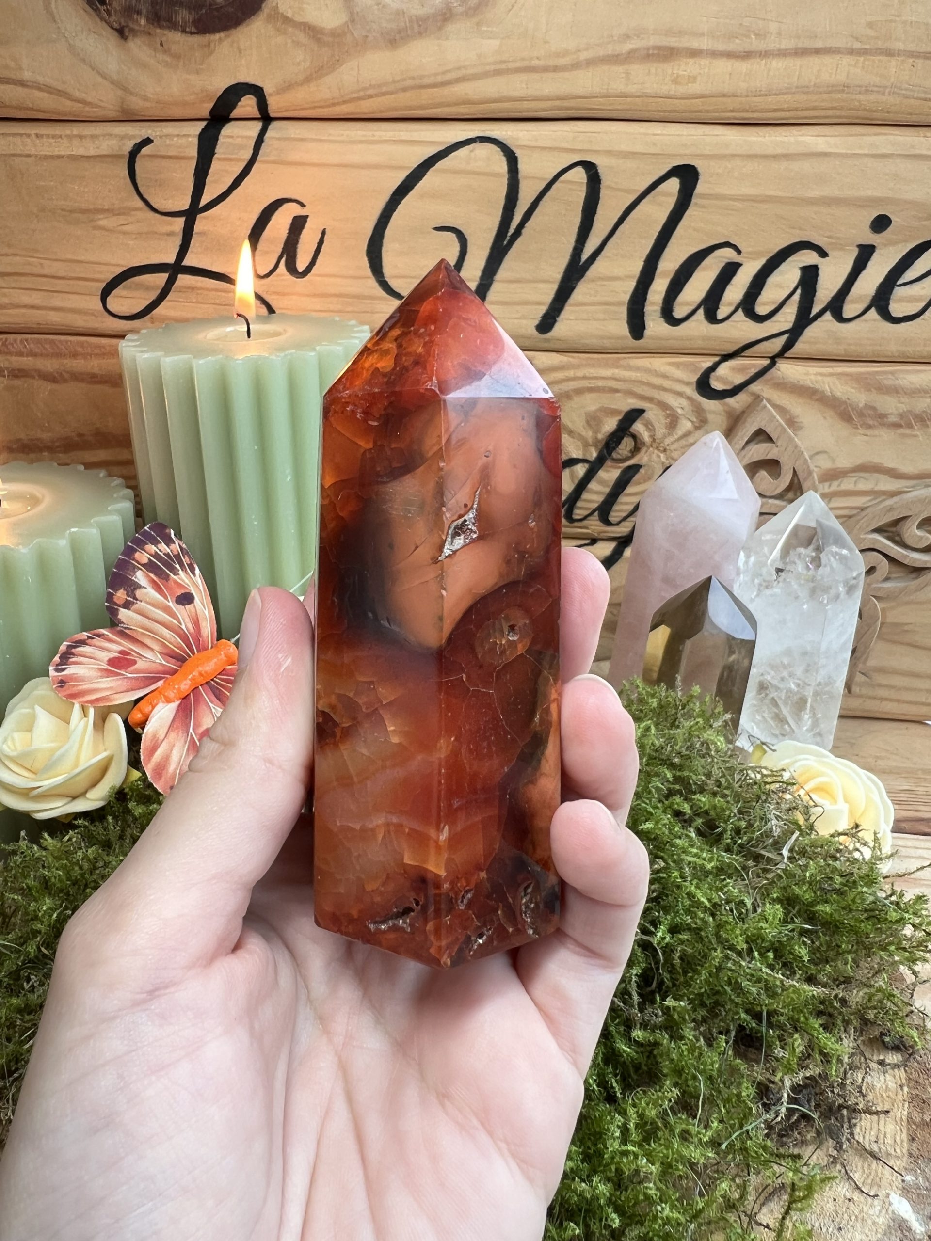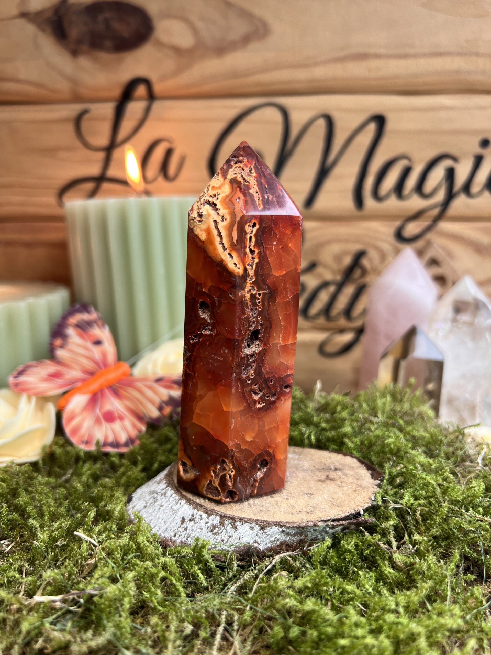 Le prisme est une forme qui dirige l’énergie. Il concentre la vibration de la Cornaline et la projette dans une direction claire : parfait pour poser une intention, dynamiser un lieu, accompagner une séance de soin ou de méditation. La cavité visible dans la pierre ajoute une dimension de profondeur et d’authenticité.